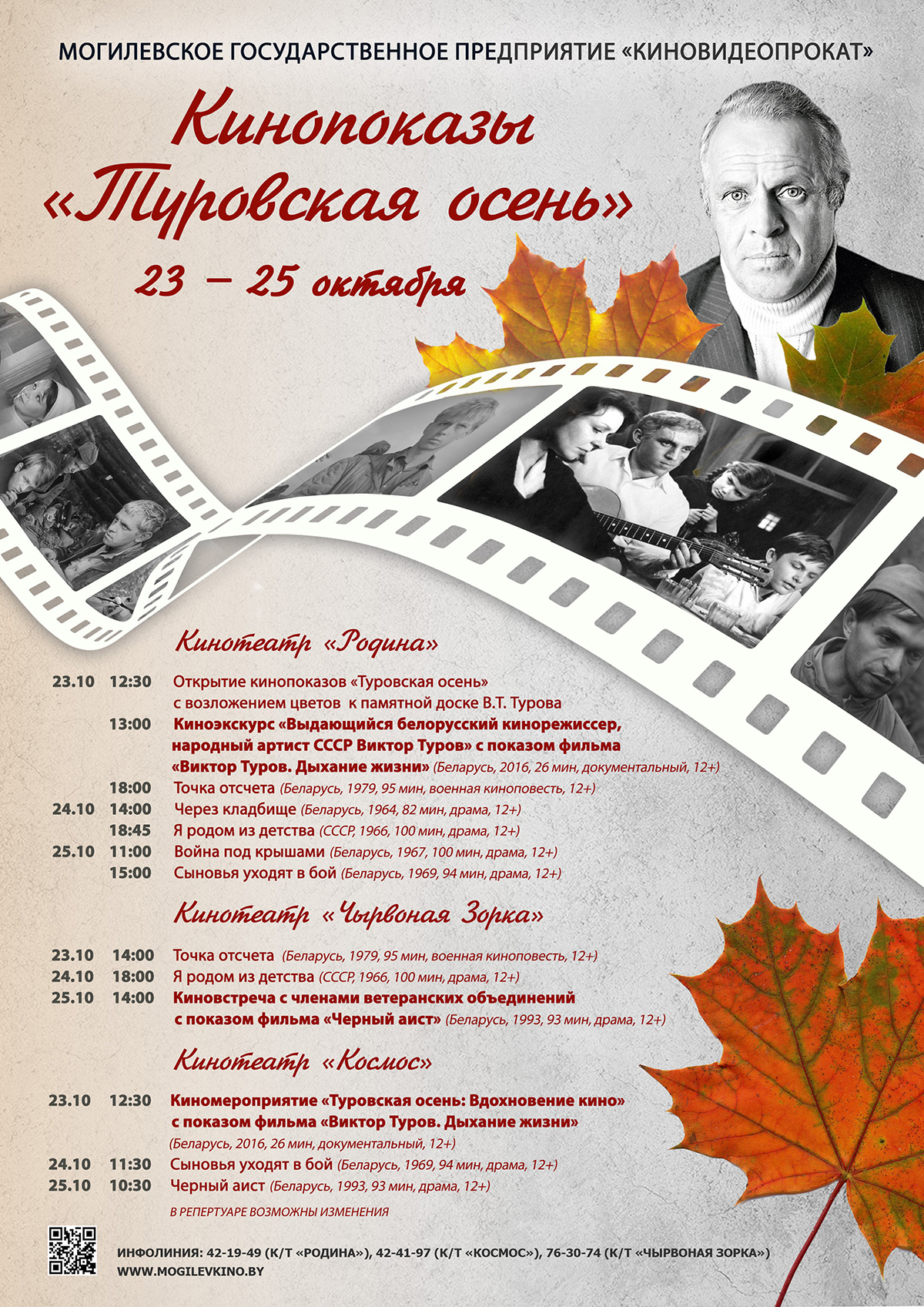 С 23 по 25 октября кинотеатры «Родина», «Чырвоная Зорка», «Космос» приглашают на ретроспективу фильмов «Туровская осень», которая ежегодно проводится в память о выдающемся белорусском кинорежиссере и сценаристе, народном артисте СССР и БССР, лауреате Государственной премии СССР и Государственной премии Республики Беларусь, нашем земляке Викторе Тимофеевиче Турове. Об этом рассказали на предприятии «Киновидеопрокат».