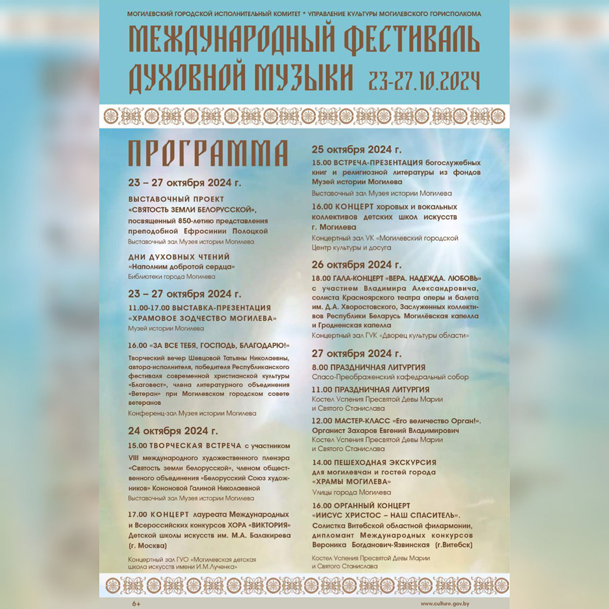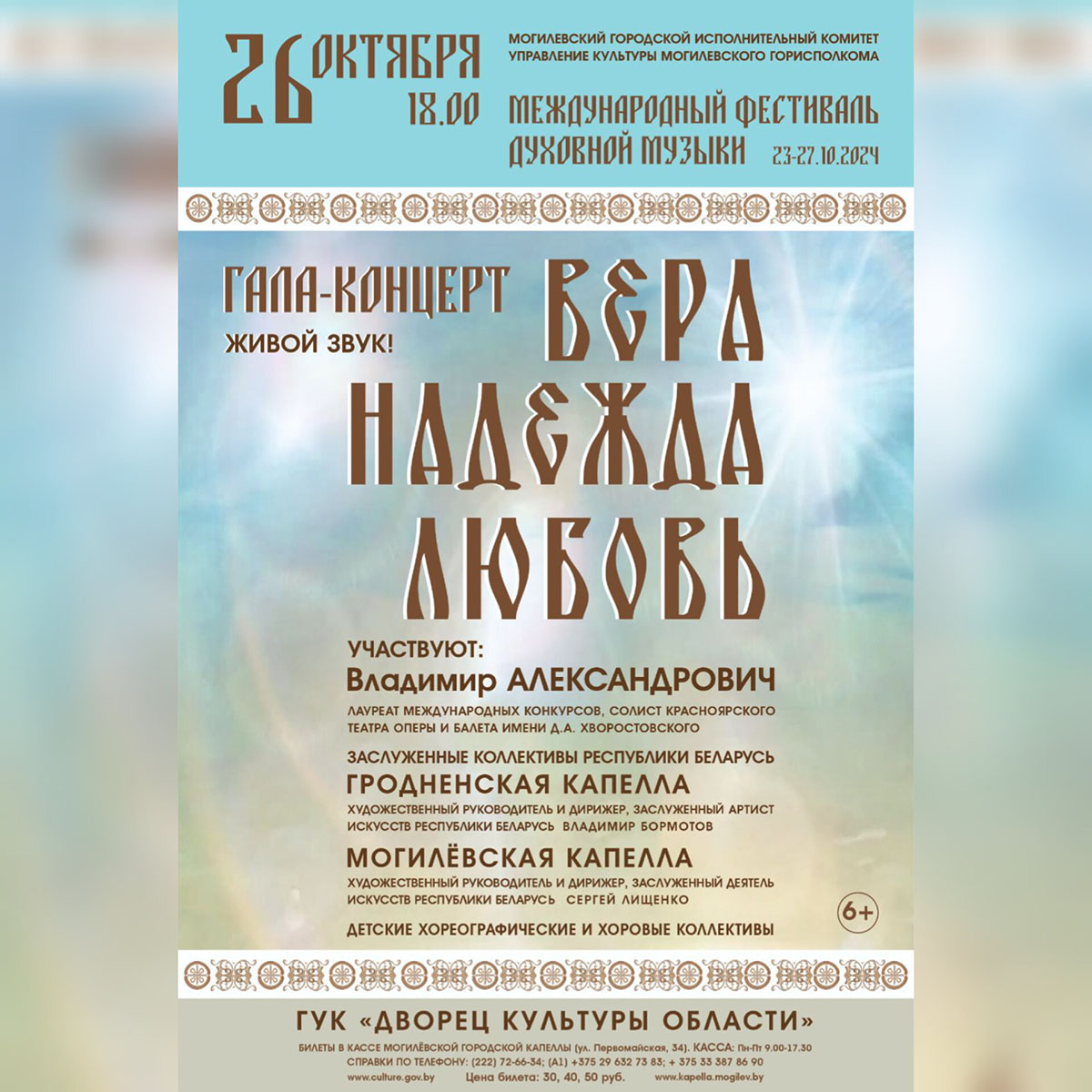 Масштабным мероприятием станет гала-концерт «Вера. Надежда. Любовь» с участием солиста Красноярского театра оперы и балета им. Д.А.Хворостовского Владимира Александровича; заслуженных коллективов Республики Беларусь Могилевской капеллы и Гродненской капеллы.