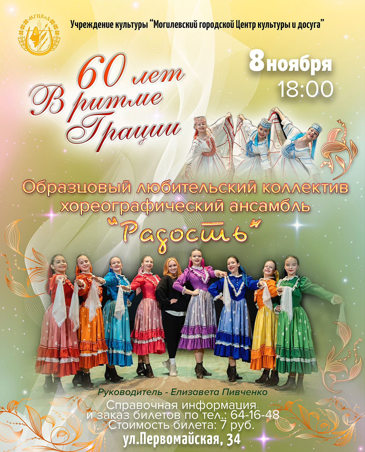Программу под названием «60 лет в ритме грации» коллектив под руководством Елизаветы Пивченко представит на сцене городского центра культуры и досуга (ул.Первомайская, 34).