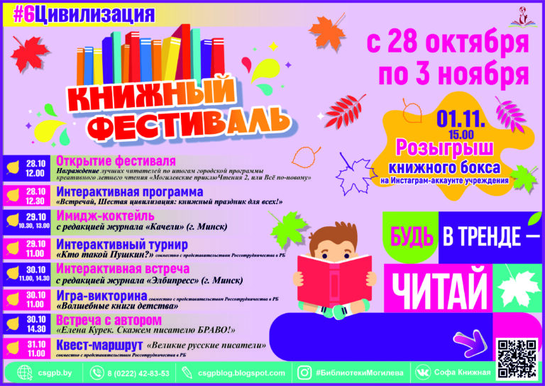 Также на протяжении всего фестиваля в библиотеках пройдет комплекс развлекательно-познавательных мероприятий и цикл игровых выставок, а блог «Свой книжный» познакомит юных могилевчан с литературными рекомендациями от книжных блогеров. Также будет возможность выиграть приз, приняв участие в розыгрыше книжного бокса в Инстаграм-аккаунте учреждения #БиблиотекиМогилева.
