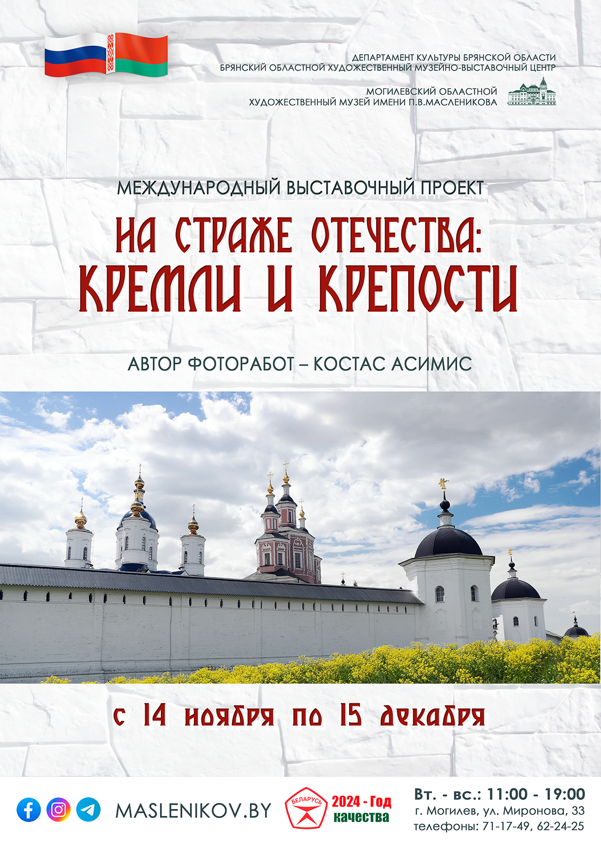Торжественное открытие выставки «На страже Отечества: кремли и крепости» фотохудожника Костаса Асимиса состоится 14 ноября в музее им. П.В.Масленикова. Об этом сообщили в учреждении культуры.