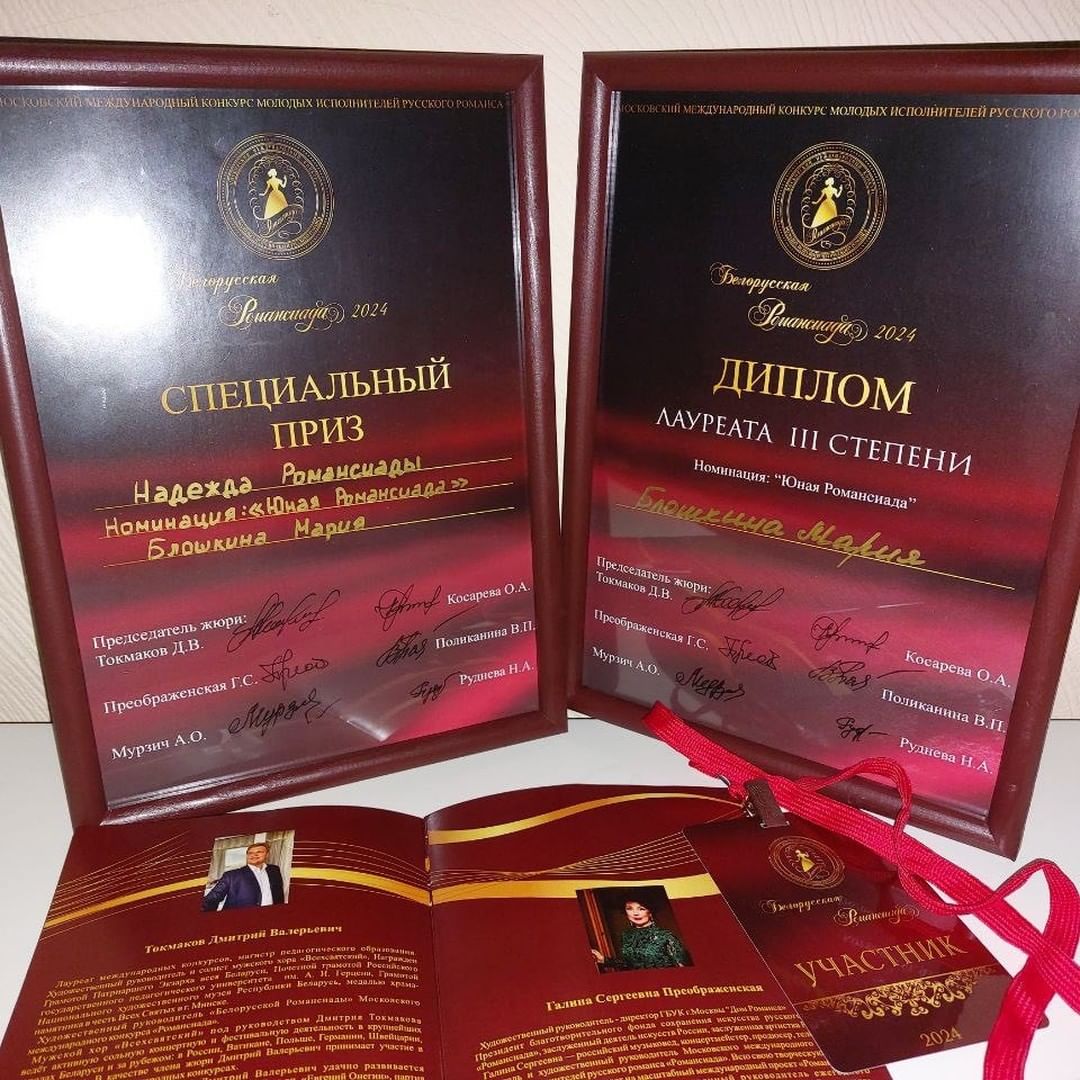 Учащаяся Могилевской государственной гимназии-колледжа искусств имени Евгения Глебова Мария Блошкина стала лауреатом III степени в категории «Юная романсиада», а также получила специальный приз «Надежда Романсиады». Об этом сообщили в учреждении образования.