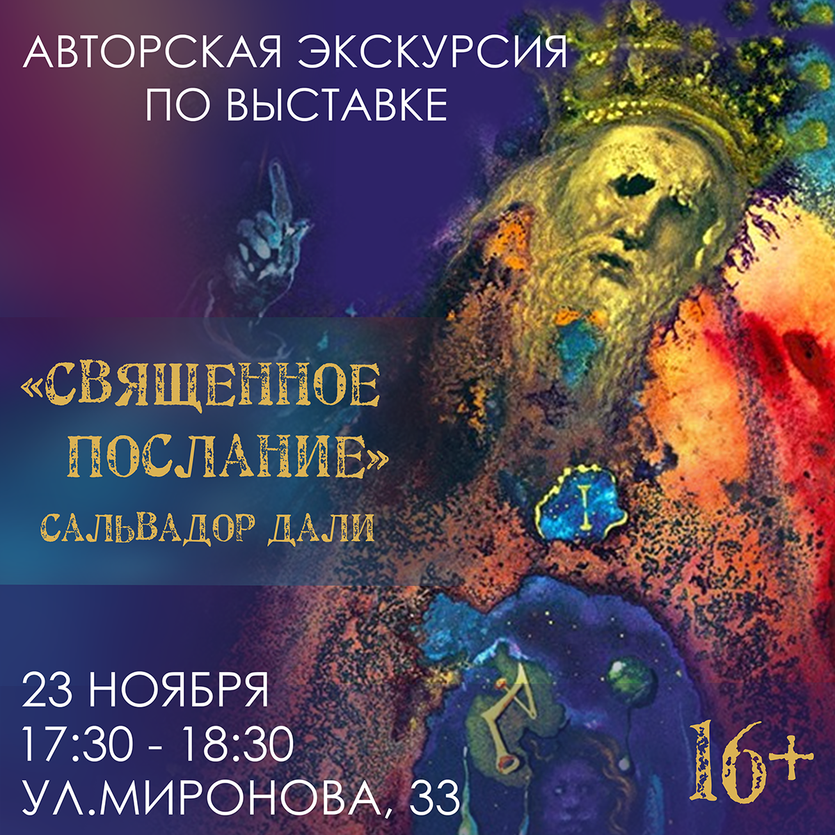 В субботу, 23 ноября, в учреждении культуры состоится авторская экскурсия по выставке «Священное послание». Сальвадор Дали«. Участники мероприятия познакомятся с жизнью и особенностями творчества самого узнаваемого сюрреалиста и великого эксцентрика. Начало — в 17.30.