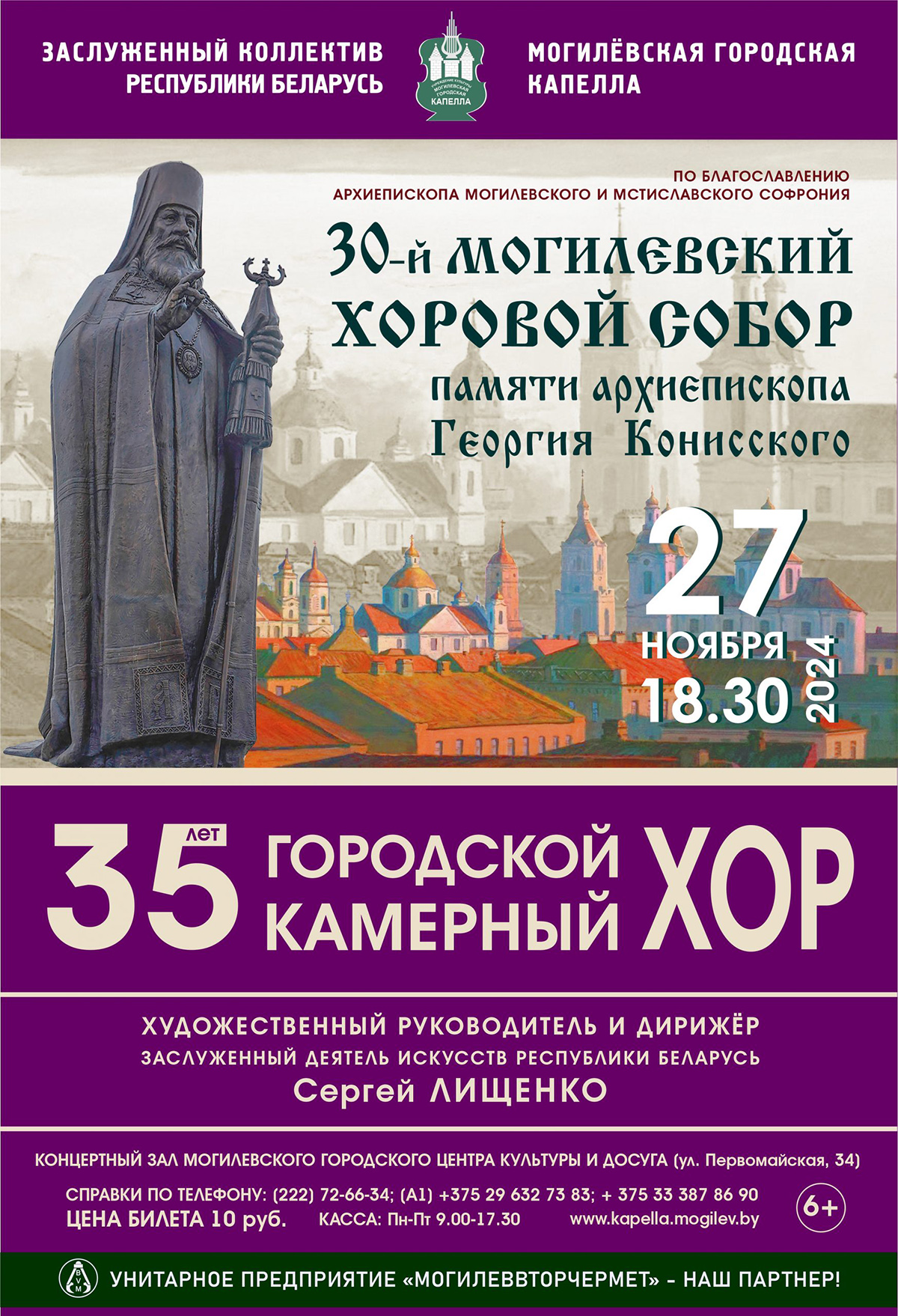— На протяжении 30 лет в исполнении камерного хора под управлением Заслуженного деятеля искусств Республики Беларусь Сергея Лищенко в Могилеве звучат концерты духовной музыки в честь архиепископа Могилевского и Белорусского Георгия Конисского. Несмотря на веяния изменчивой музыкальной моды, коллектив успешно развивается, по-прежнему сохраняя национальные культурные ценности и лучшие традиции духовного и хорового искусства, — отметили в городской капелле. — Вторая часть концертной программы будет посвящена еще одной знаменательной дате — 35-летию городского камерного хора.