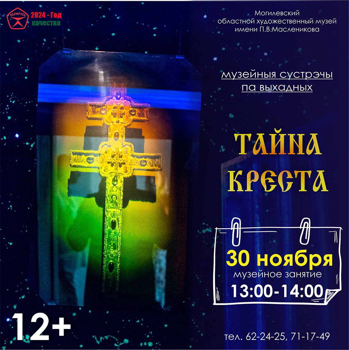 Так, в субботу, 30 ноября, в учреждении культуры пройдет музейное занятие «Тайна креста». Гостям музея расскажут о Кресте Евфросинии Полоцкой, а также продемонстрируют восстановленную бронированную комнату-сейф с голографической копией Креста, оригинал которого хранился в стенах музея до начала Великой Отечественной войны, но был утрачен. Кроме того, участники мероприятия узнают о технологии голографии, благодаря которой можно воссоздать любое изображение в трехмерном пространстве.