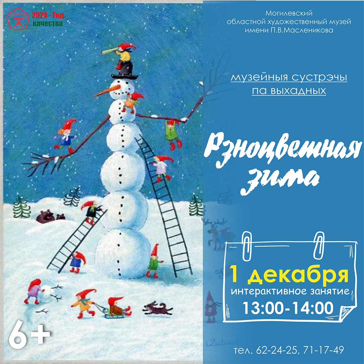 В воскресенье, 1 декабря, в музее состоится интерактивное занятие «Разноцветная зима», рассчитанное на детей дошкольного и младшего школьного возраста. Участников мероприятия ждут игры-загадки «Собери снежинку», «Собери снеговика», «Снежки», «Укрась елочку» и другие. После гости музея смогут нарисовать зимний пейзаж.