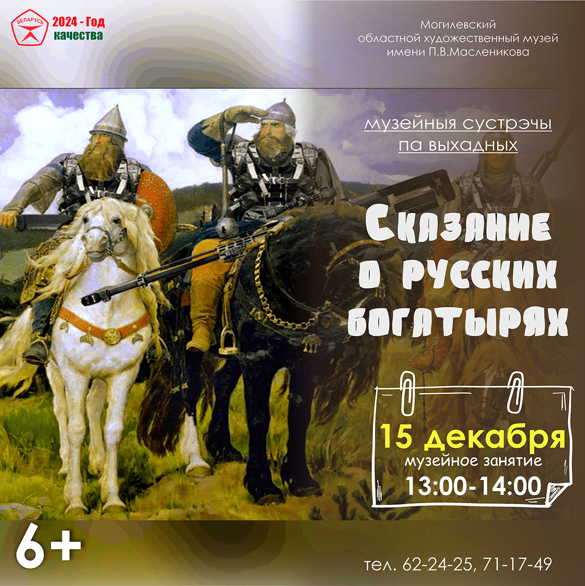 В воскресенье, 15 декабря, в учреждении культуры состоится музейное занятие «Сказание о русских богатырях», во время которого могилевчане не только услышат увлекательный рассказ, но и смогут попробовать себя в обличье древних воинов.