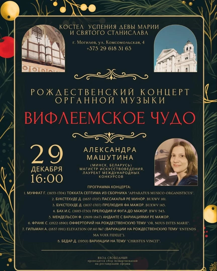 Рождественский концерт органной музыки пройдет 29 декабря в костеле Успения Девы Марии и Святого Станислава (ул. Комсомольская, 4).