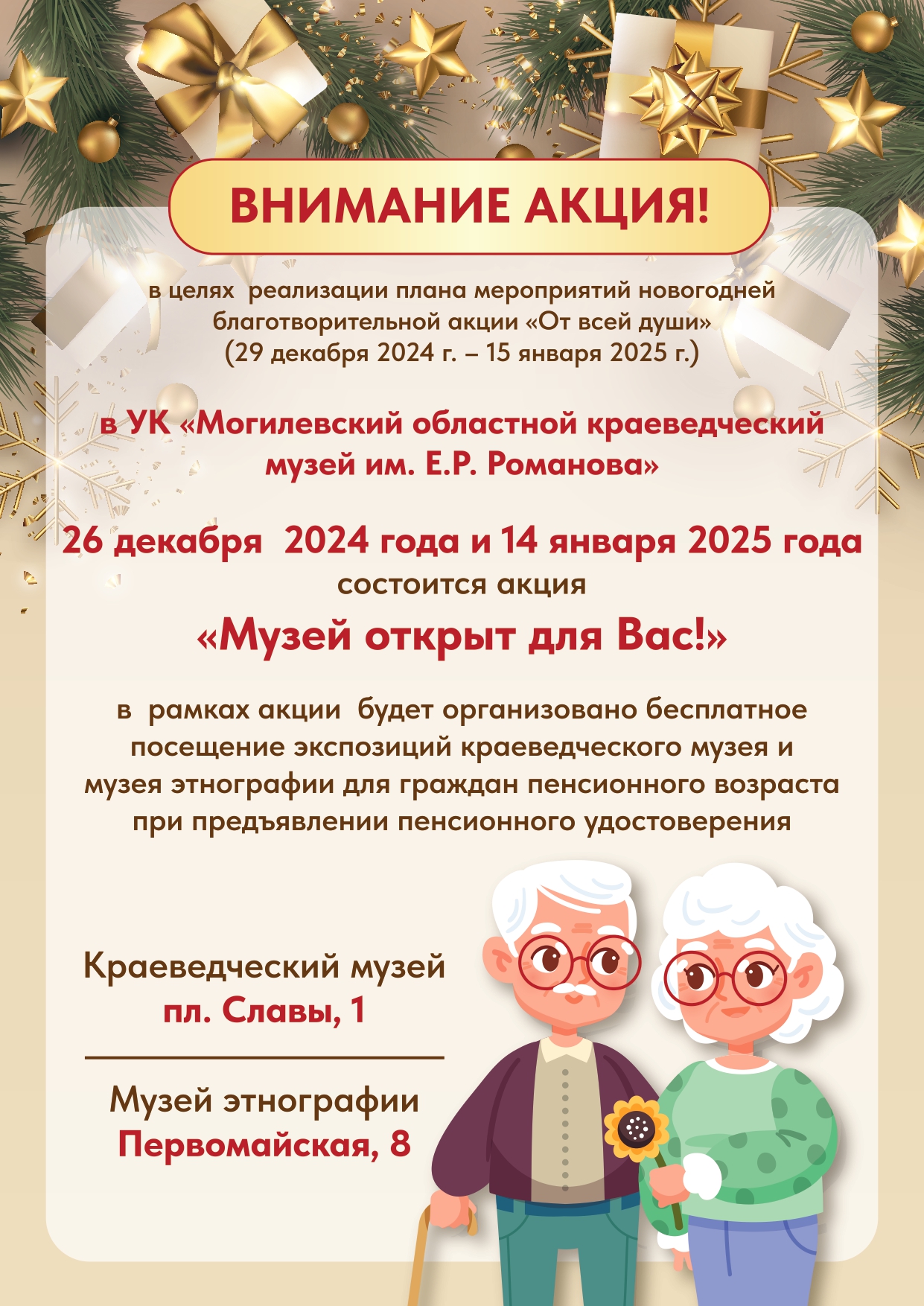 В рамках акции «Музей открыт для Вас!» могилевчане пенсионного возраста смогут бесплатно посетить ряд музеев 26 декабря и 14 января.