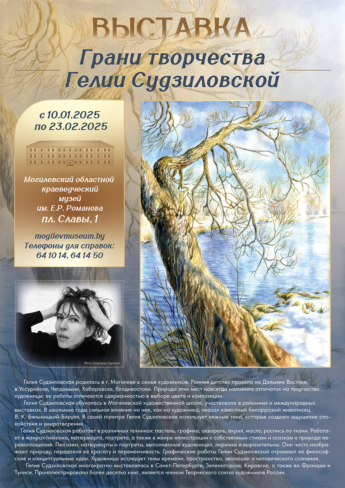 Выставка «Грани творчества» Гелии Судзиловской начнет работу с 10 января в Могилевском областном краеведческом музее им. Е.Р.Романова (пл.Славы, 1).