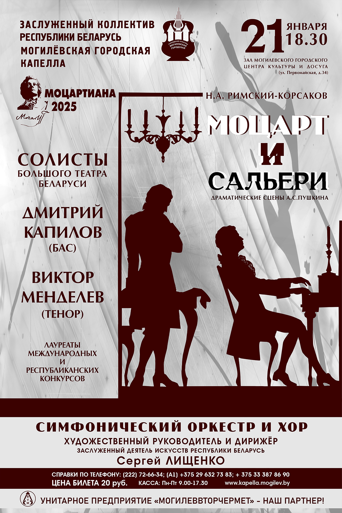 Заслуженный коллектив Республики Беларусь Могилевская городская капелла 21 января представит новую программу из цикла «Моцартиана» — это будут драматические сцены А.С. Пушкина, по которым Н.А. Римским-Корсаковым была написана опера «Моцарт и Сальери».