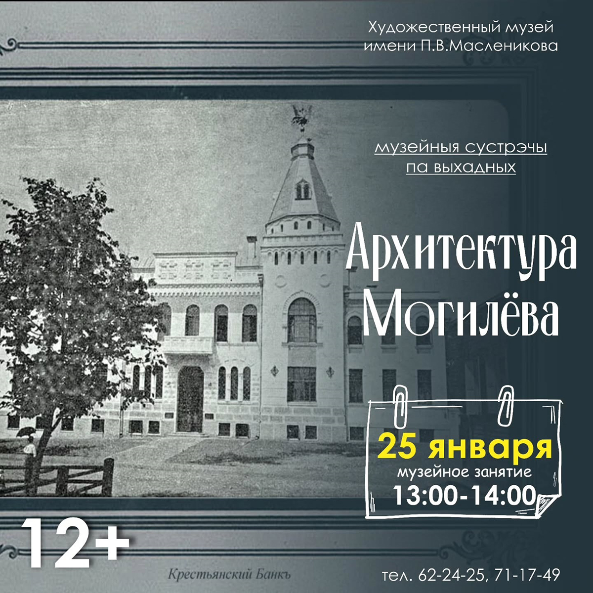 В субботу, 25 января, в учреждении культуры пройдет музейное занятие «Архитектура Могилева», во время которого жителям областного центра расскажут об уникальных памятниках архитектуры города, их особенностях и истории. Также участники мероприятия проследят, как исторические события оказывали влияние на принципы гражданского строительства, и познакомятся с живописными полотнами художников, запечатлевших памятники архитектуры, связывающие и объединяющие людей разных поколений.