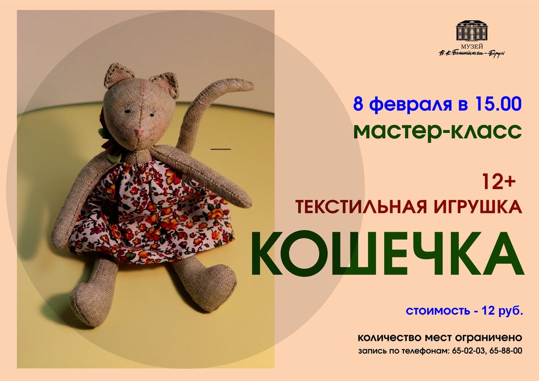 Мастер-класс по изготовлению текстильной игрушки «Кошечка» пройдет 8 февраля в музее В.К. Бялыницкого-Бирули (ул.Ленинская, 37).