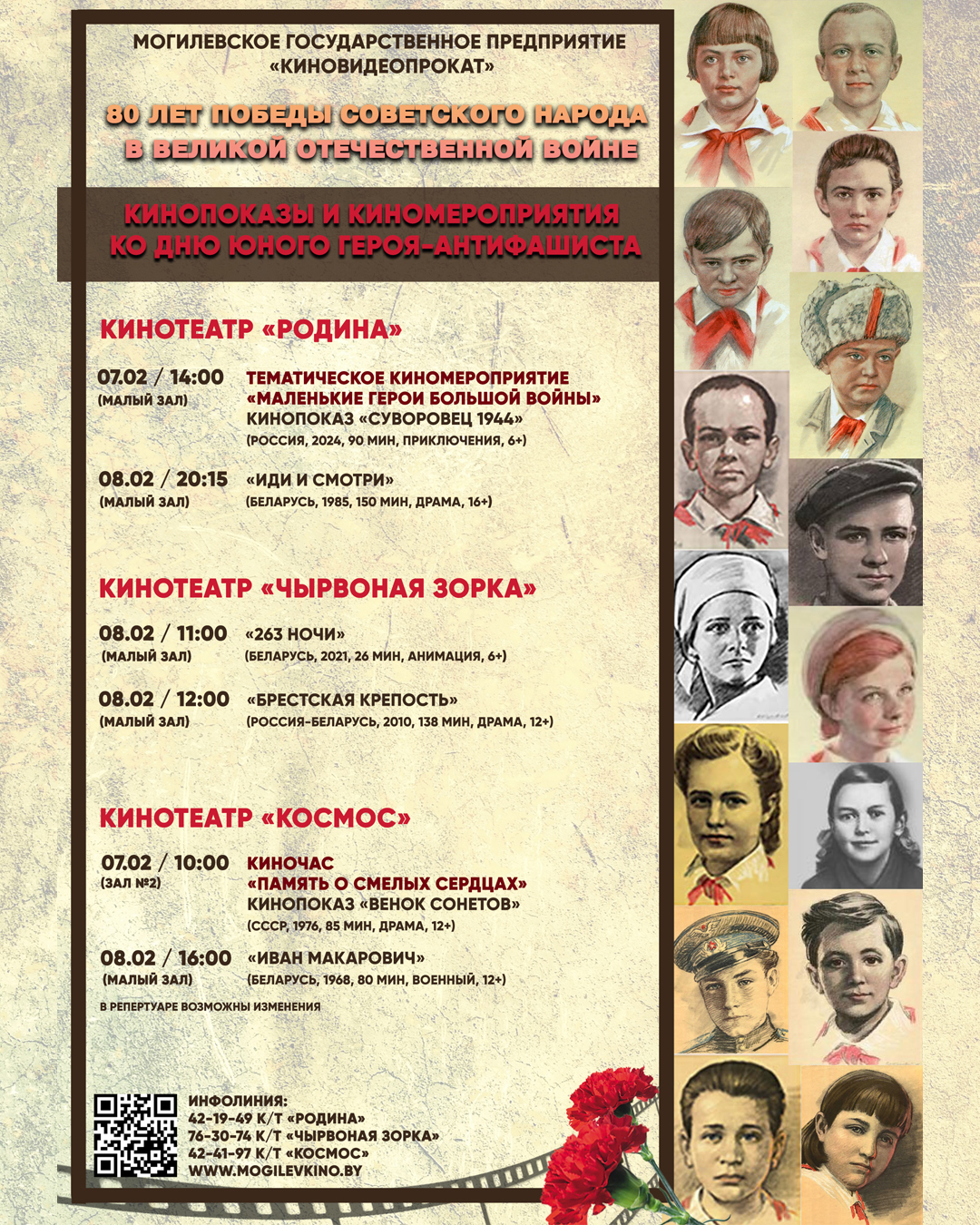 Киномероприятия и кинопоказы ко Дню юного героя-антифашиста пройдут в могилевских кинотеатрах 7 и 8 февраля, сообщили на предприятии «Киновидеопрокат».