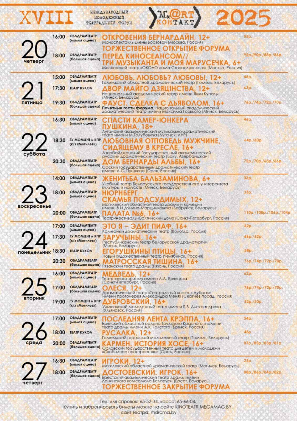 Программа XVIII Международного молодежного театрального форума «M.@rt контакт-2025» – в афише. Билеты можно приобрести в кассе театра, а также на сайте megamag.by.