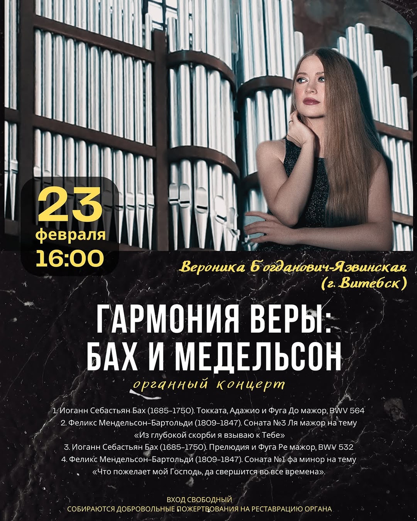Программу «Гармония веры: Бах и Мендельсон» представит органистка из Витебска Вероника Богданович-Язвинская.