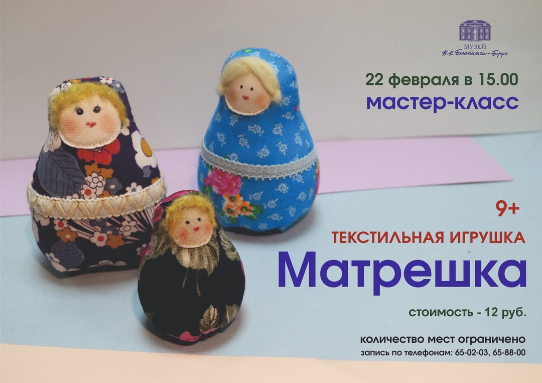 Мастер-класс по изготовлению текстильной игрушки «Матрешка» состоится 22 февраля в музее В.К. Бялыницкого-Бирули (ул.Ленинская, 37).
