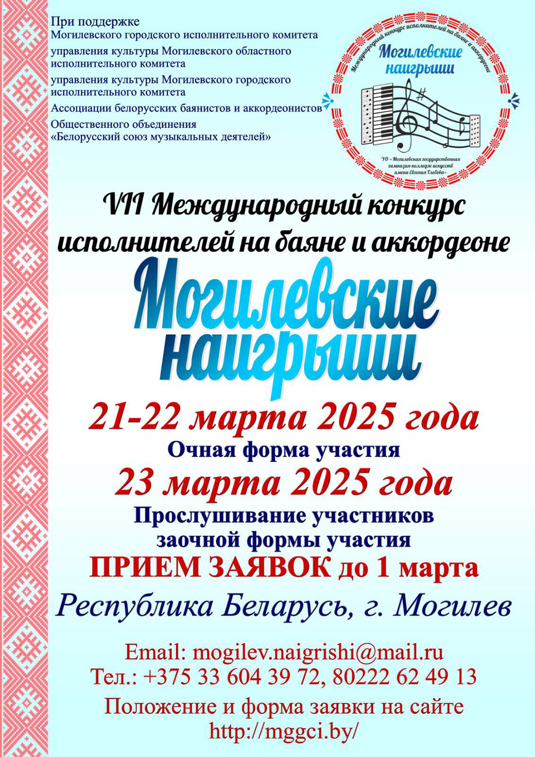 Подать заявку на участие можно до 1 марта 2025 года в электронном виде на электронную почту Адрес электронной почты защищен от спам-ботов. Для просмотра адреса в вашем браузере должен быть включен Javascript. с пометкой «конкурс Могилевские наигрыши».