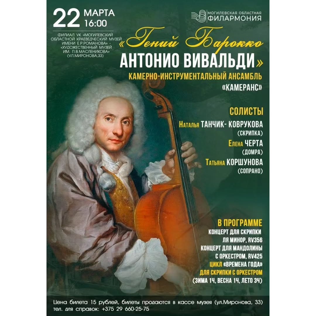 Концерт «Гений Барокко. Антонио Вивальди» состоится в музее имени П.В.Масленикова 22 марта. Программу представит камерно-инструментальный ансамбль «КамерАнс».
