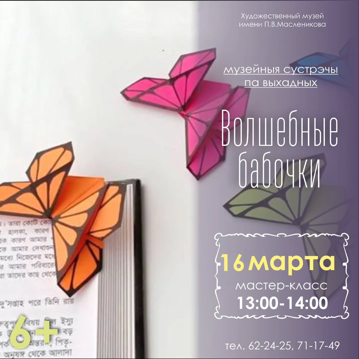 В воскресенье, 16 марта, в музее состоится мастер-класс «Волшебные бабочки». На занятии могилевчан познакомят с техникой оригами, а далее участники смогут создать в этой технике бабочек своими руками. Начало мастер-класса в 13:00.