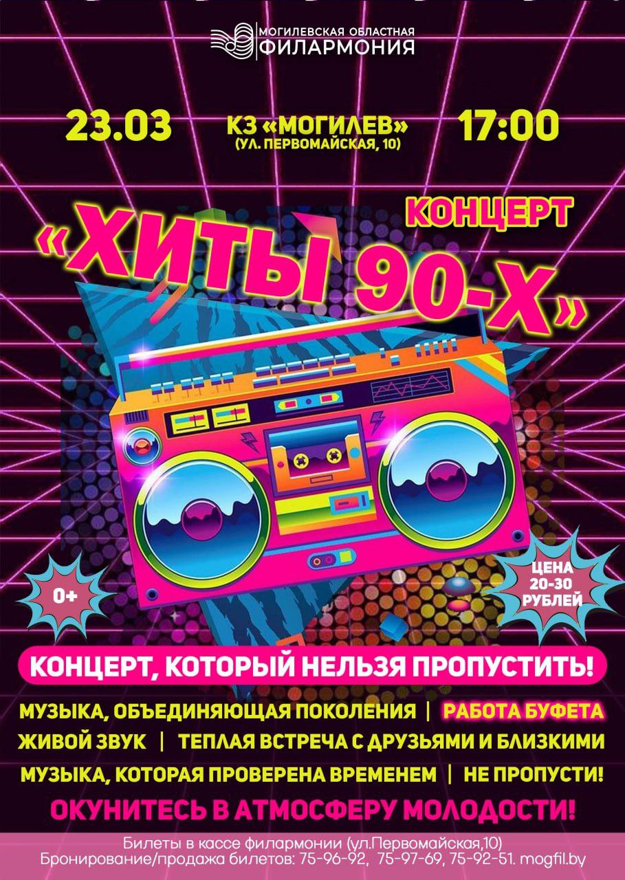 Концерт «Хиты 90-х» пройдет в областном центре 23 марта. Программу на сцене КЗ «Могилев» представят артисты областной филармонии.