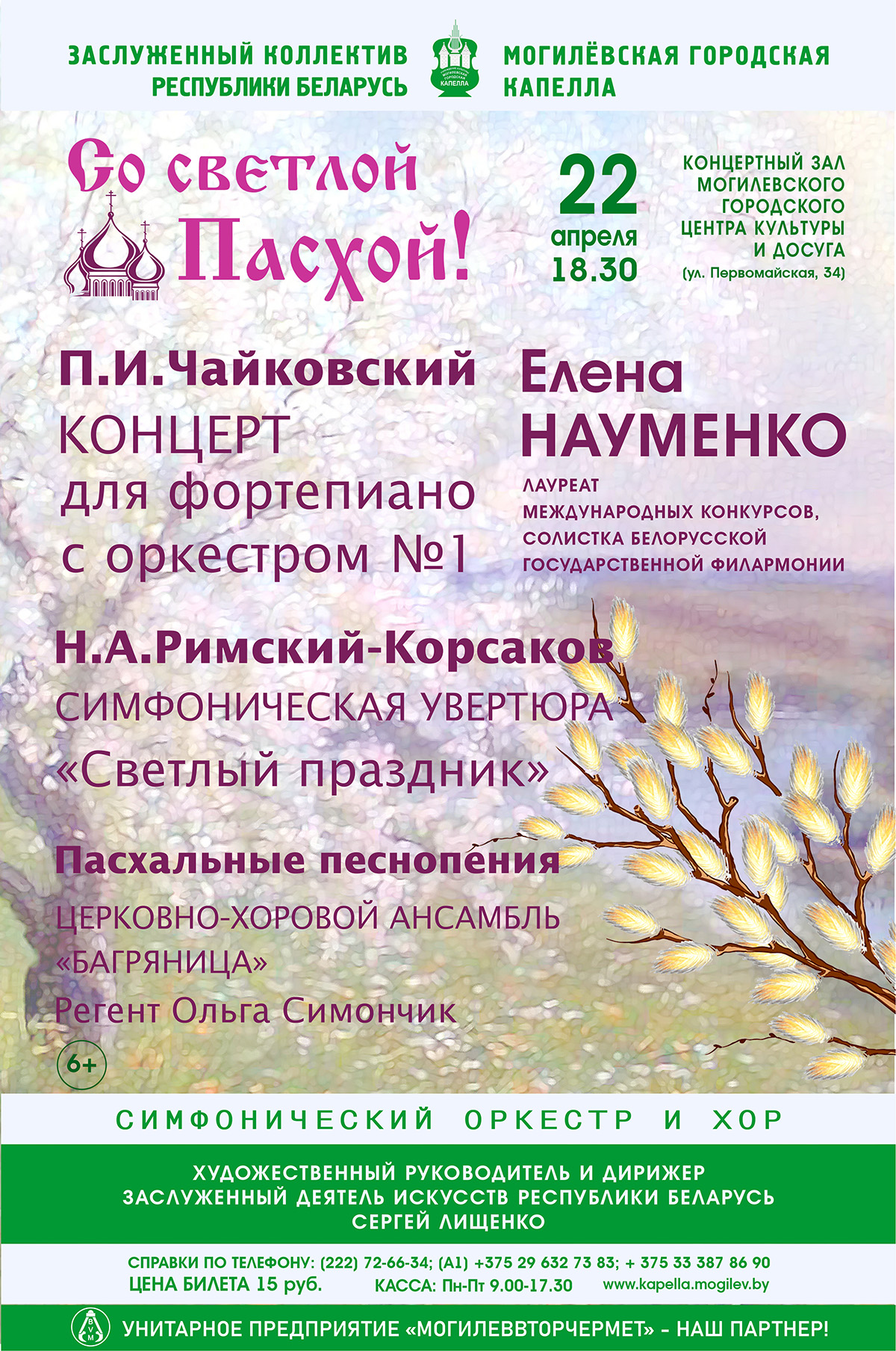 Во время творческого мероприятия для могилевчан прозвучат Концерт для фортепиано с оркестром № 1 П.И. Чайковского, симфоническая увертюра «Светлый праздник» Н.А. Римского-Корсакова, пасхальные песнопения. Концерт пройдет с участием лауреата международных конкурсов, солистки Белорусской государственной филармонии Елены Науменко, а также церковно-хорового ансамбля «Багряница» (регент Ольга Симончик).