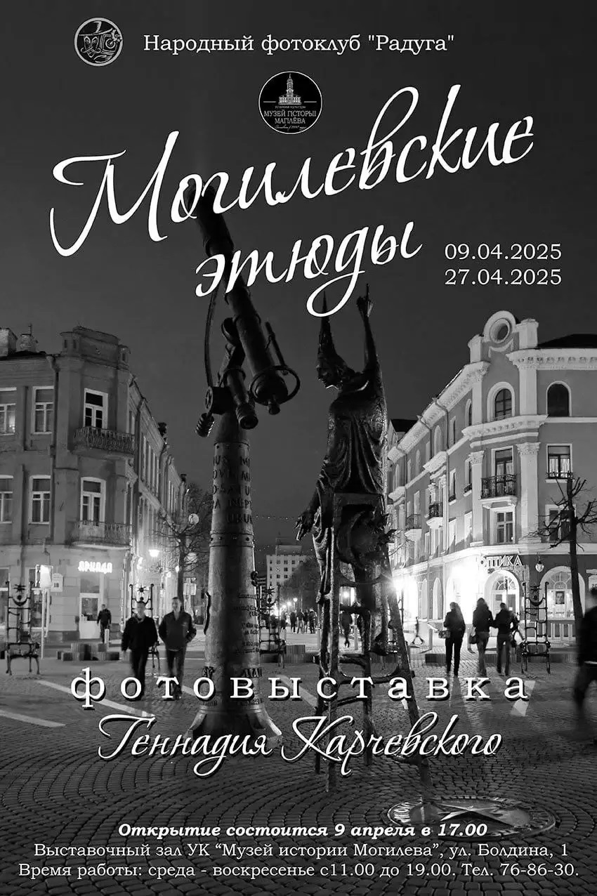 «Могилевские этюды» — так называется творческий проект Геннадия Карчевского. В экспозиции представлены работы автора разных лет. Главная тема — это сам город Могилев и его жители, жанровые фотографии, человек в городской среде, во время праздников (День города, Ночь музеев, ежегодного международного фестиваля «Март-контакт»). Также в экспозиции представлены портреты — как постановочные, так и репортажные.