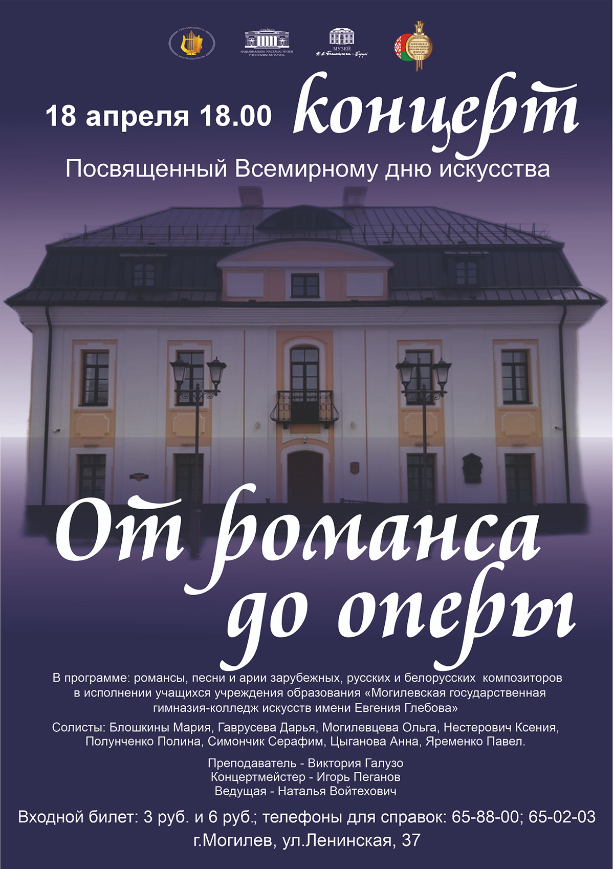 Концертную программу «От романса до оперы» представят 18 апреля учащиеся Могилевской государственной гимназии-колледжа искусств имени Евгения Глебова. Мероприятие, приуроченное ко Всемирному дню искусства, пройдет в музее В.К.Бялыницкого-Бирули (ул.Ленинская, 37).