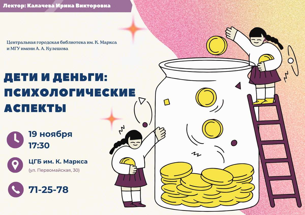 Открытый психологический лекторий состоится 19 ноября в Центральной городской библиотеке им. К.Маркса (ул.Первомайская, 30). В этот раз мероприятие пройдет на тему: «Дети и деньги: психологические аспекты».
