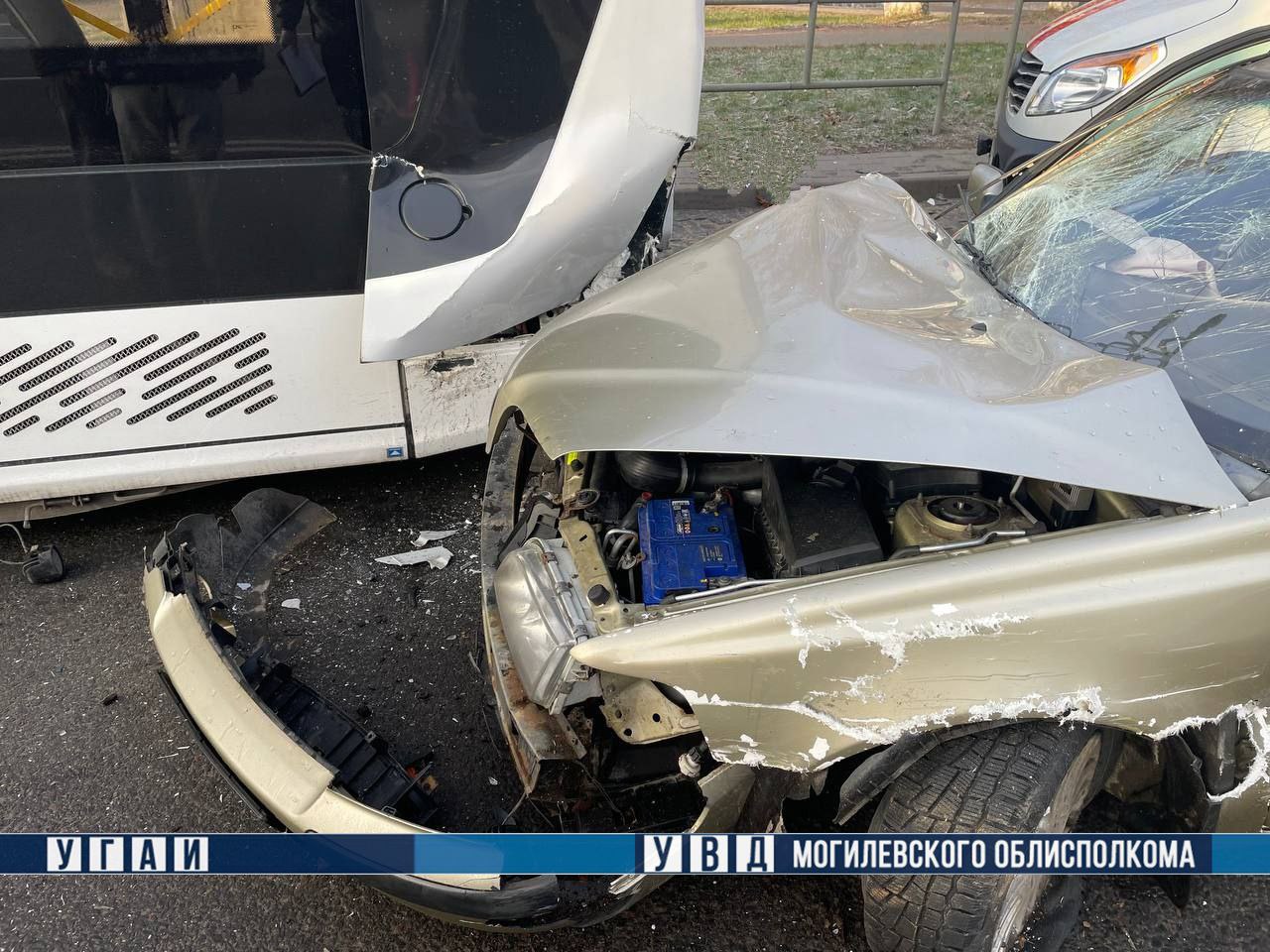 В Могилеве на улице Первомайской 54-летний водитель экскаватора-погрузчика JSB, чтобы объехать троллейбус, остановившийся на остановочном пункте, выехал на крайнюю левую полосу движения, где произошло столкновение с автомобилем Volvo. От удара легковую машину отбросило и она врезалась в троллейбус.