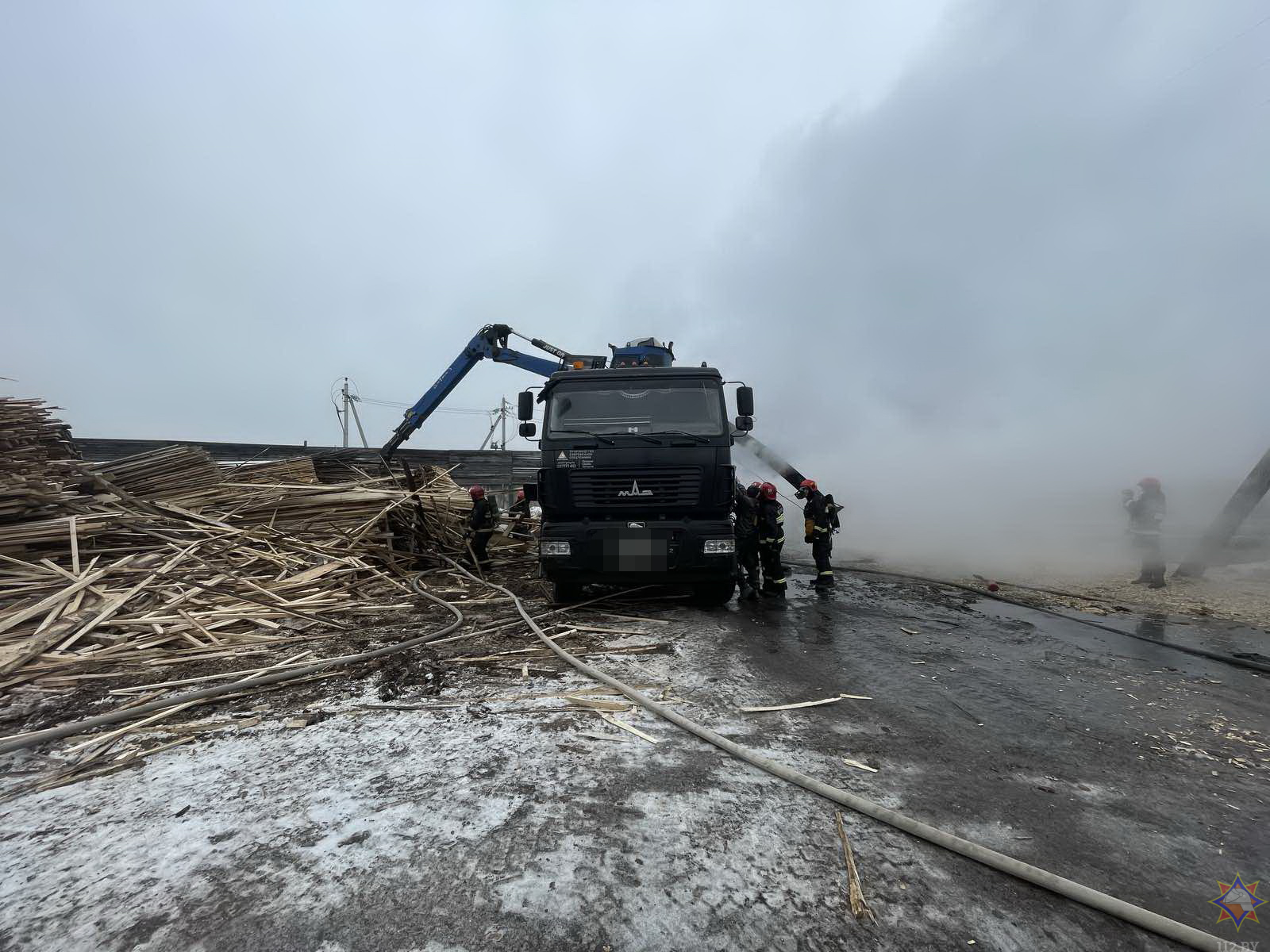 По прибытии к месту вызова спасателей открытым пламенем горела деревоперерабатывающая установка, установленная на платформе автомобиля МАЗ. До этого водитель автомобиля пытался с помощью огнетушителя справиться с пожаром, но только работники МЧС смогли укротить стихию.