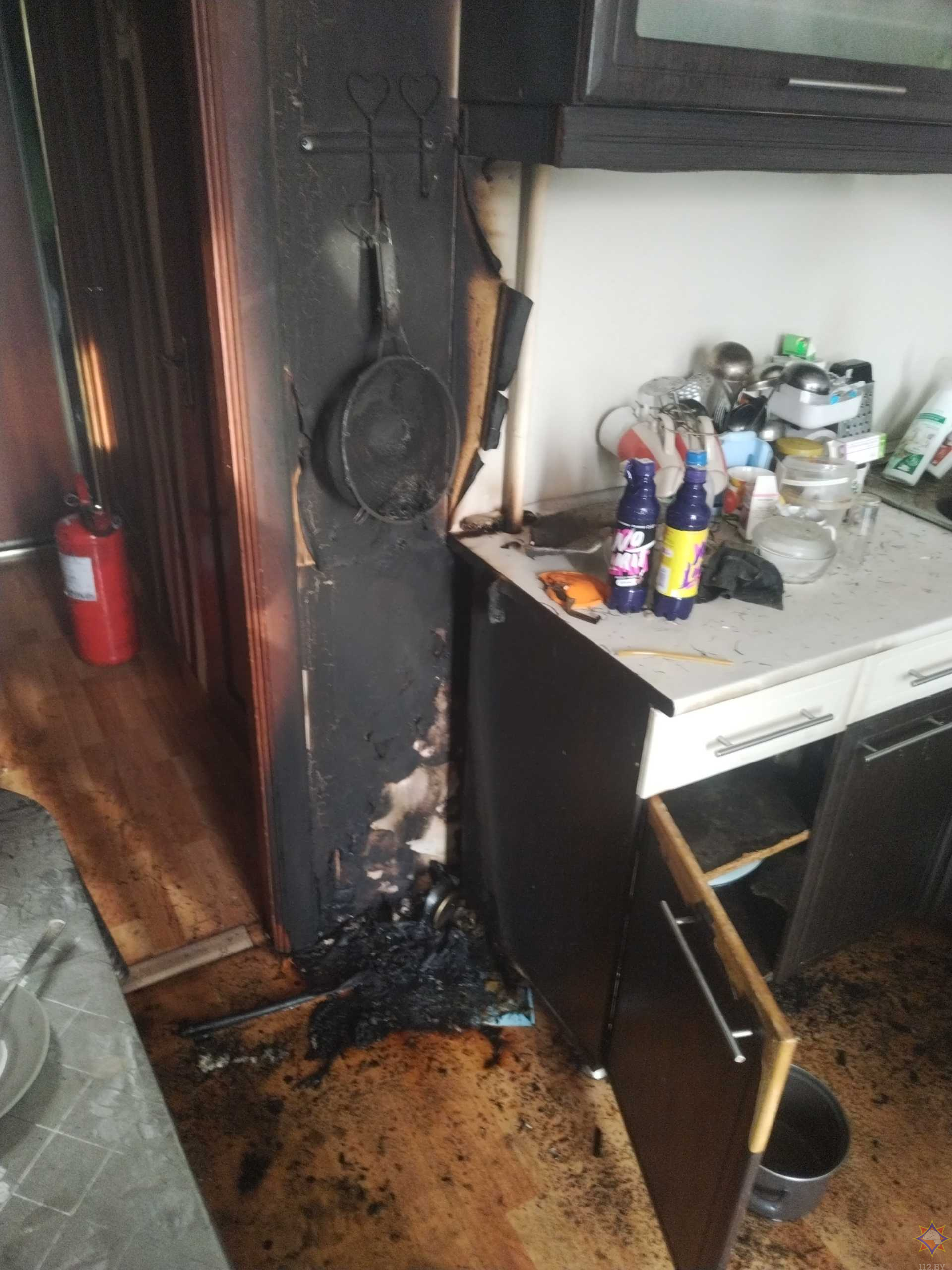 В результате пожара на кухне повреждена стена и два мебельных ящика. Никто не пострадал.