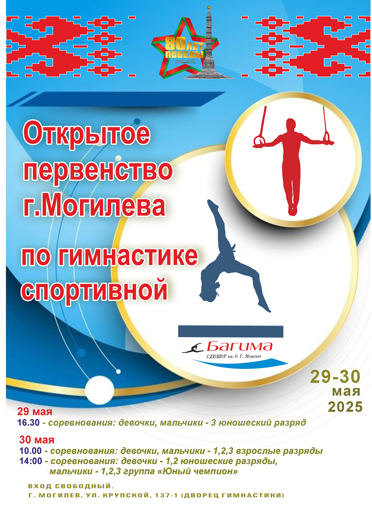 Открытое первенство Могилева по спортивной гимнастике, посвященное 80-летию Победы советского народа в Великой Отечественной войне, пройдет в областном центре 29-30 мая. Площадкой для соревнований станет городская СДЮШОР «Багима» им. О.Г. Мищенко.