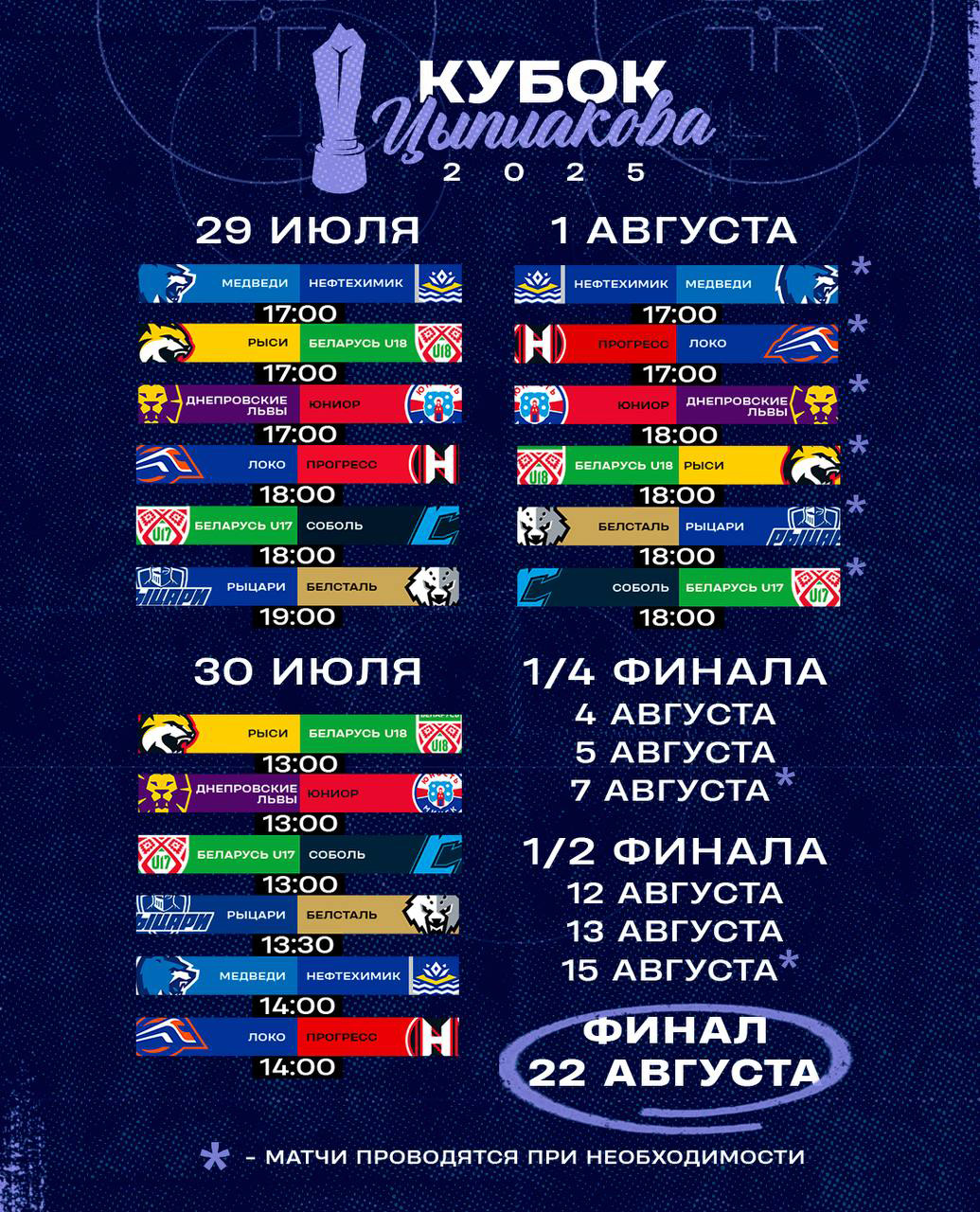 Матчи 1/4 финала состоятся 4, 5 и 7 августа, полуфинальные встречи пройдут 12, 13, и 15 августа. Финал Кубка Цыплакова запланирован на 22 августа.