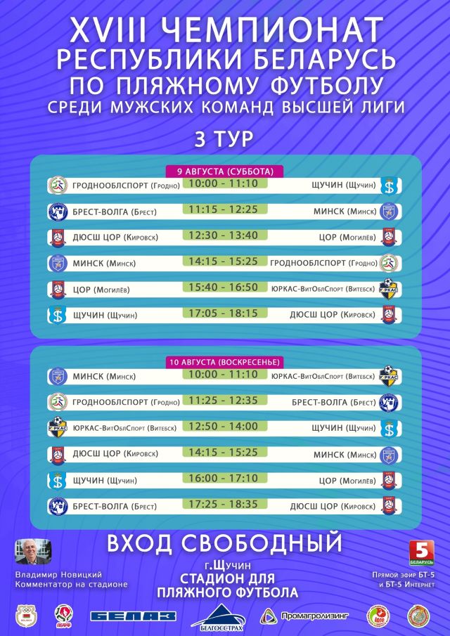 Третий тур ХVIII чемпионата Республики Беларусь по пляжному футболу 2025 среди мужских команд высшей лиги пройдет 9-10 августа в Щучине на стадионе для пляжного футбола.