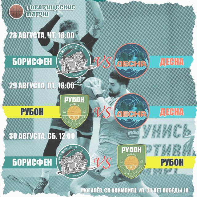 Первая игра между «Борисфеном» и «Десной» пройдет 28 августа. Начало в 18:00. Противостояние «Рубон» –«Десна» запланировано на 29 августа (18:00). Могилевские и витебские баскетболисты сразятся 30 августа. Начало встречи в 12:00.