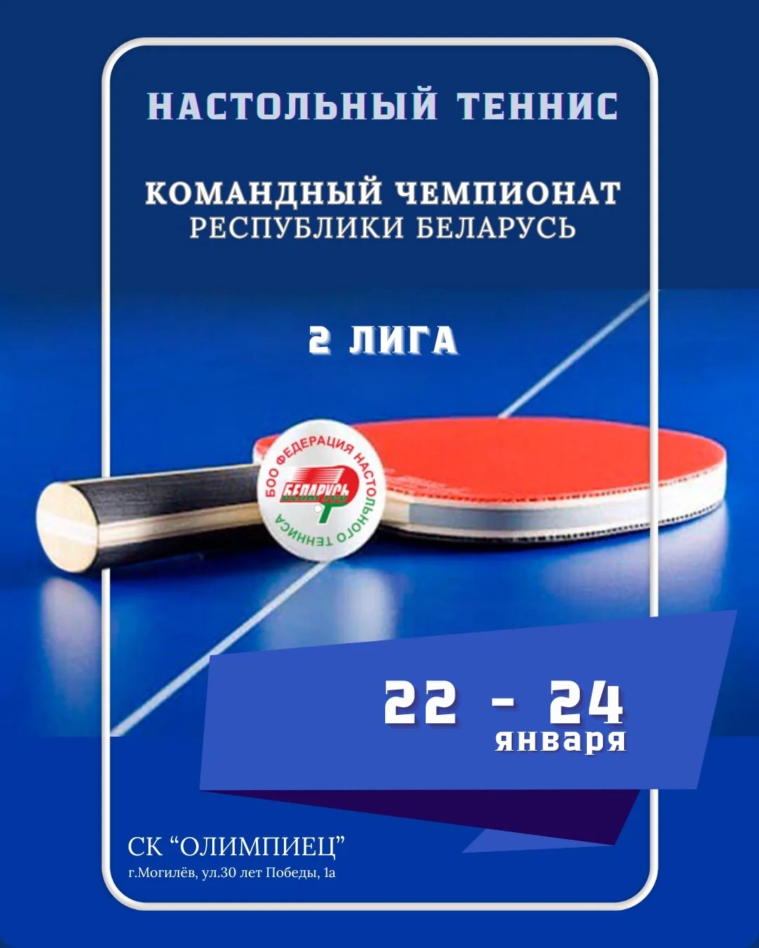 С 22 по 24 января в зале игровых видов спорта СК «Олимпиец» вступят в борьбу мужчины и женщины во 2 лиге командного чемпионата Республики Беларусь по настольному теннису.