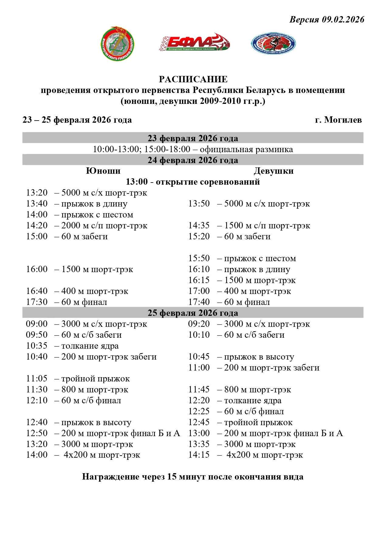 В программе проходящего турнира будут представлены следующие виды: бег 60 м, 60 м с барьерами, 400 м, 800 м, 3000 м; спортивная ходьба 3000 м; прыжки в длину, в высоту, с шестом; толкание ядра; троеборье. По результатам первенства в команду отберутся обладатели двух первых мест, а третий участник будет определен решением тренерского состава.