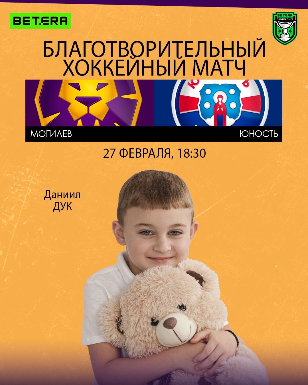 В областном центре 27 февраля пройдет благотворительный хоккейный матч в поддержку Даниила Дука. У мальчика тяжелое генетическое заболевание – миопатия Дюшенна. Это уже вторая благотворительная игра, организованная ХК «Могилев», в поддержку Даниила, сообщили в пресс-службе клуба.