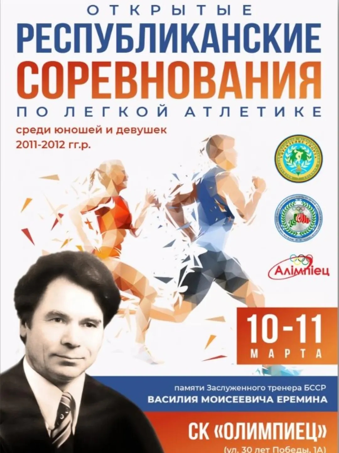 В легкоатлетическом манеже СК «Олимпиец» 10-11 марта состоятся традиционные республиканские соревнования по легкой атлетике памяти заслуженного тренера БССР Василия Моисеевича Еремина.
