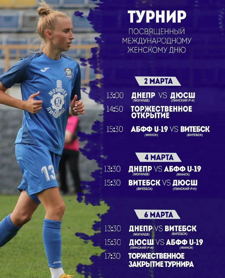 Республиканский турнир по футболу среди женских команд пройдет в Могилеве с 2 по 6 марта. Участие в турнире примут 4 команды — «Днепр», «Витебск», молодежная сборная страны АБФФ U-19 и команда ДЮСШ Пинского района.