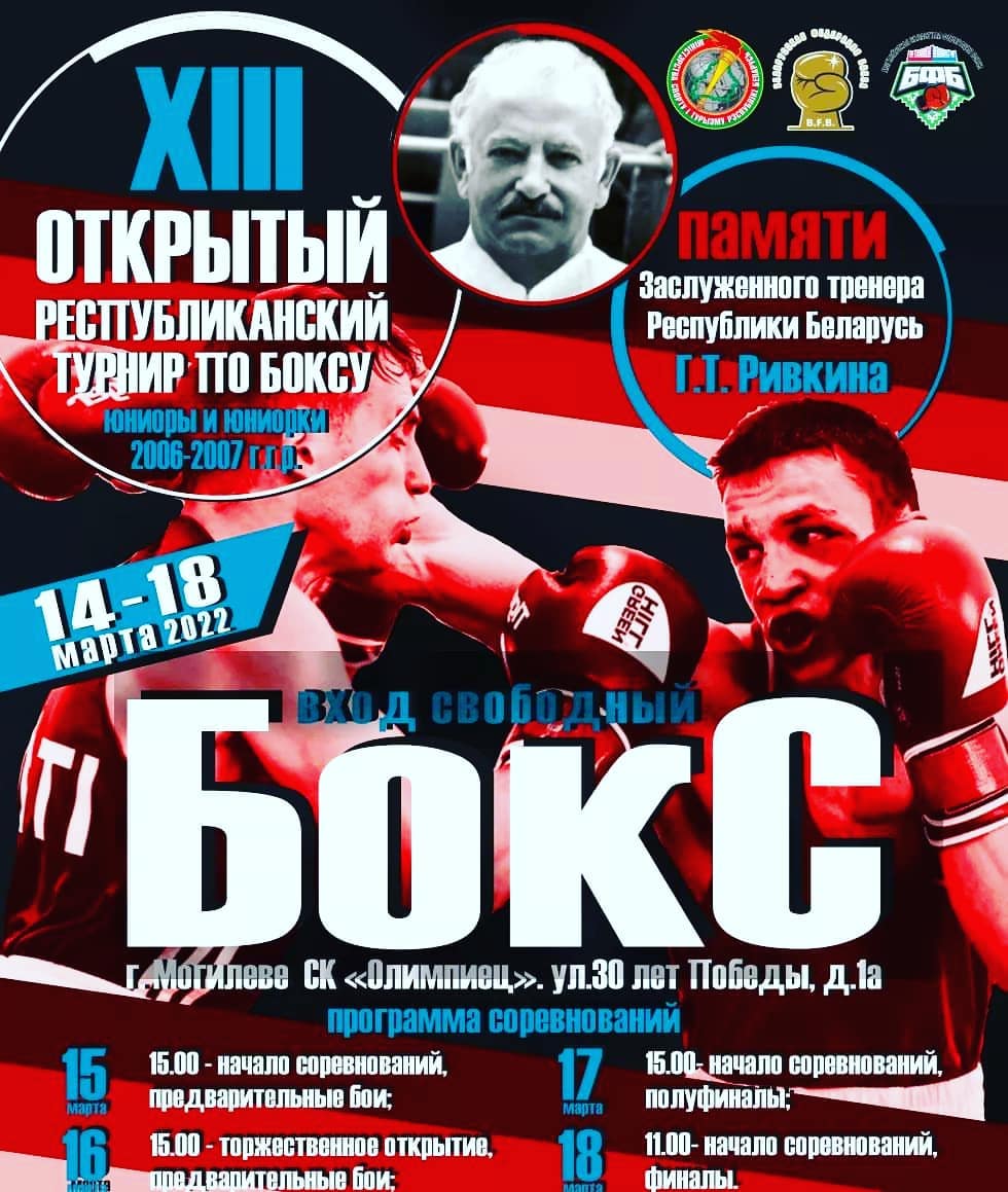 XIII открытый республиканский турнир по боксу памяти Заслуженного тренера Республики Беларусь Г.Т.Ривкина пройдет в СК «Олимпиец» с 15 по 18 марта.