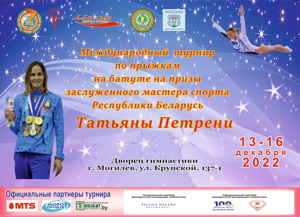 С 13 по 16 декабря в могилевском Дворце гимнастики пройдет Международный турнир по прыжкам на батуте на призы заслуженного мастера спорта Республики Беларусь Татьяны Петрени. В соревнованиях будут принимать участие лучшие спортсмены из Беларуси и России.