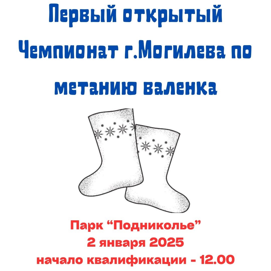 Первый открытый чемпионат по метанию валенка пройдет в Могилеве 2 января. Об этом сообщили в отделе спорта и туризма горисполкома. Местом проведения соревнований станет парк в Подниколье.