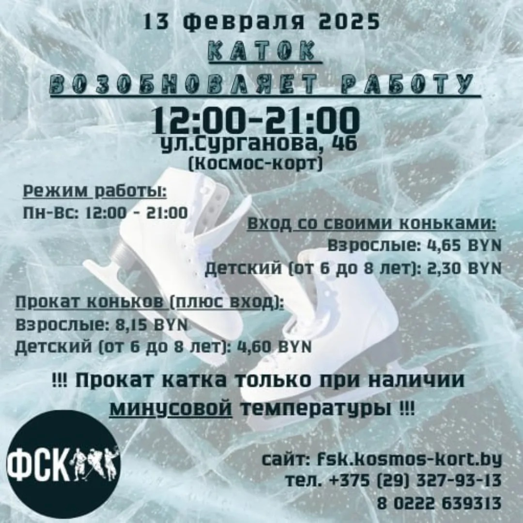 В Могилеве начинают работу катки на «Космос-корте» и стадионе «Спартак». Каток Могилевского ФСК (Сурганова, 46) открыт для посещения с 13 февраля ежедневно с 12:00 до 21:00. Со своими коньками взрослый билет будет стоить 4,65 руб., а детский (от 6 до 8 лет) – 2,30 руб. С арендой коньков стоимость будет немного выше: для взрослых составит 8,15 руб., для детей (от 6 до 8 лет) – 4,60 руб. Детям до 5 лет – бесплатно.