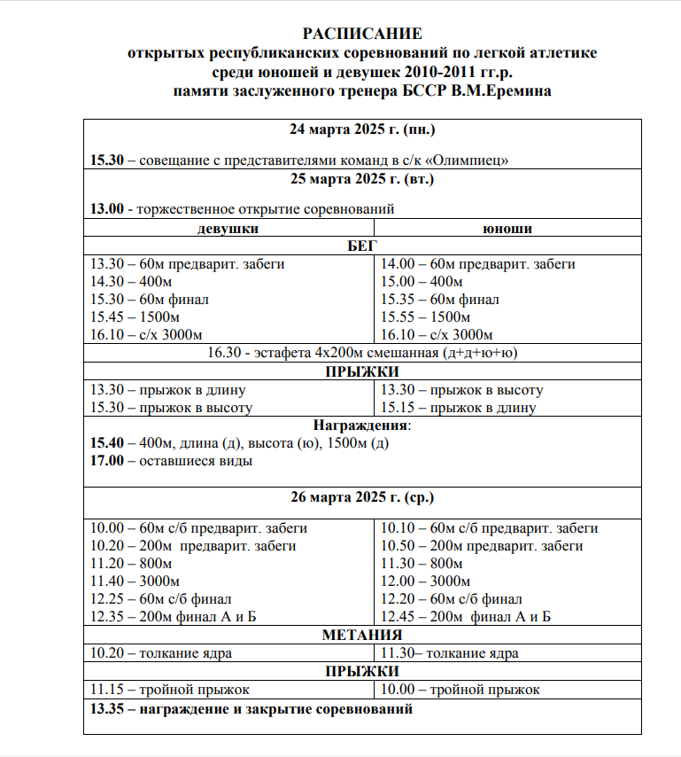 В легкоатлетическом манеже СК «Олимпиец» проходят традиционные открытые республиканские соревнования по легкой атлетике памяти заслуженного тренера БССР Василия Моисеевича Еремина.