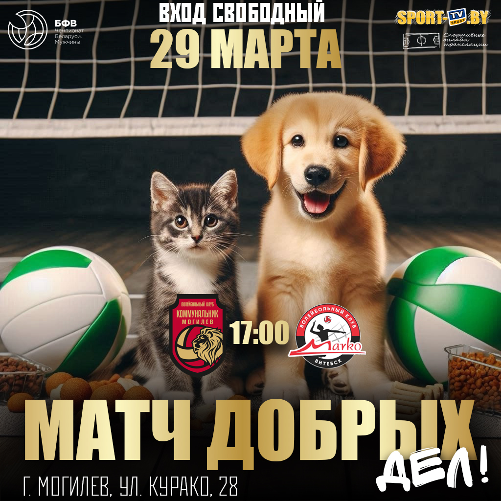 Любителей волейбола и добрых дел приглашают на матч мужских волейбольных команд «Коммунальник-Могилев» и «Марко-ВГТУ» (Витебск). Вход на игру свободный. Противостояние начнется 29 марта в 17:00 по адресу: ул. Курако, 28.
