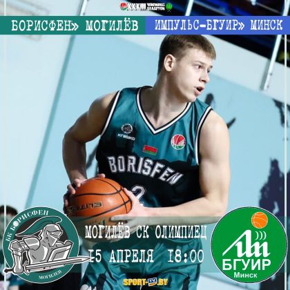 В рамках 40-го тура чемпионата Беларуси по баскетболу среди мужских команд «Борисфен» 15 апреля на домашней площадке будет принимать «Импульс-БГУИР». Игра в СК «Олимпиец» начнется в 18:00. Вход свободный.