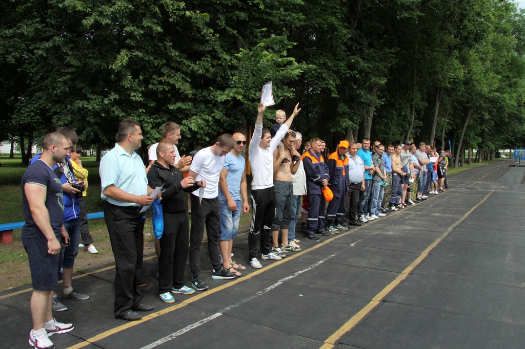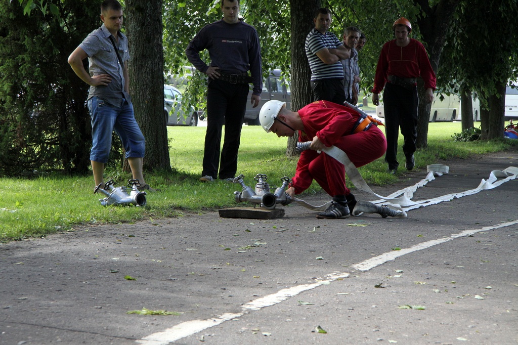 Первый конкурс включал в себя четыре отрезка по сто метров каждый. Эстафетной палочкой традиционно служил пожарный ствол. Первый участник пробегал чистую стометровку, второй — преодолевал забор, третий — пробегал по буму с пожарными рукавами, соединял их между собой и с разветвлением. Тем самым он прокладывал импровизированную рукавную линию для тушения пожара. Четвёртый участник тушил горючую жидкость в противне при помощи порошкового огнетушителя. Быстрее и слаженнее других в пожарной эстафете действовали дружинники «Могилёвлифтмаша».
