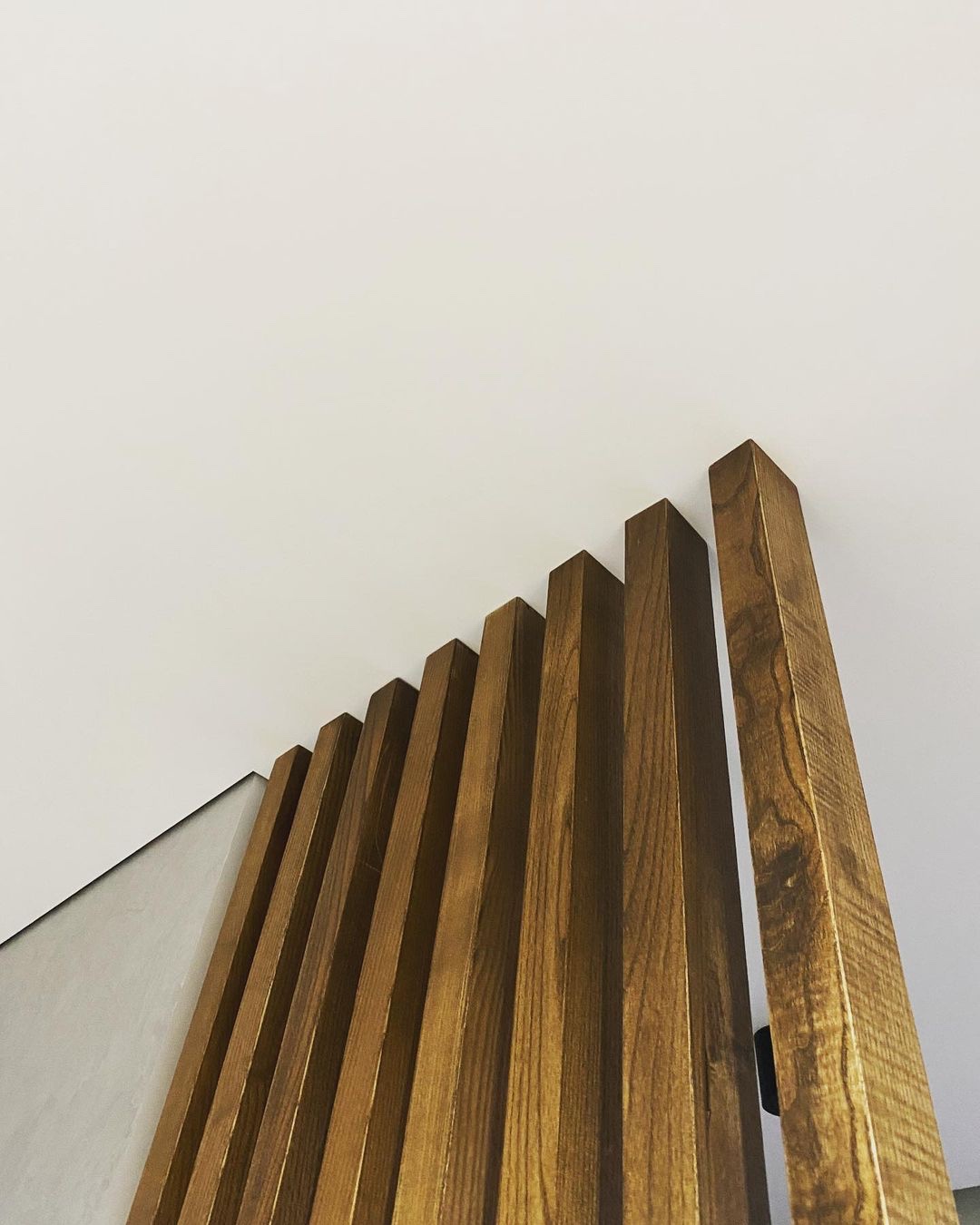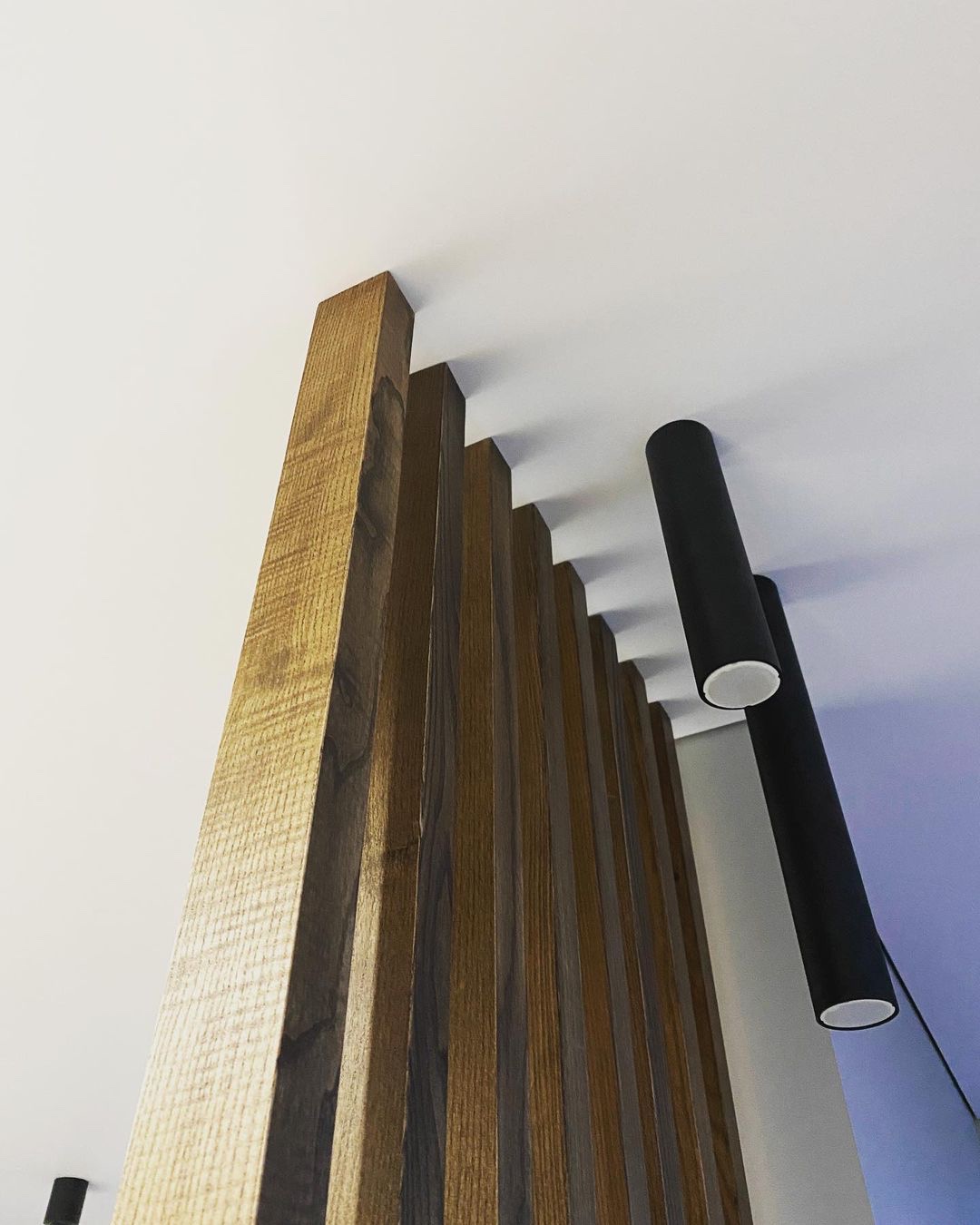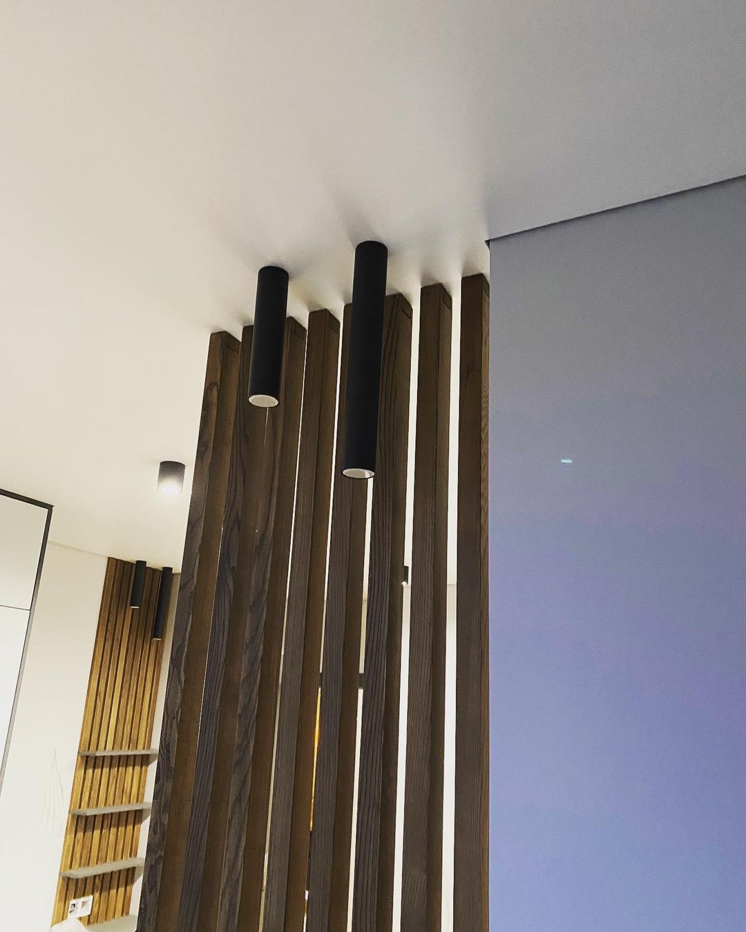 Это способ, при котором деревянные перегородки, фиксируются к основному несущему потолку. В этом варианте рейки устанавливаются до монтажа натяжного потолка. Наши специалисты устанавливают потолок, а вокруг перегородок формируют нишу в натяжной потолок. Потолочная ниша может иметь различные размеры и глубину, а также в нее можно установить светодиодную подсветку. Это новое решение визуально увеличивает высоту комнаты. Ниши могут быть изготовлены на заказ или сделаны на базе стандартных нишевых профилей SLOTT 40 и SLOTT 80 с глубиной 40 и 80 миллиметров соответственно. Профиль слотт может быть белого или черного цвета.